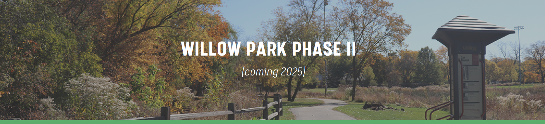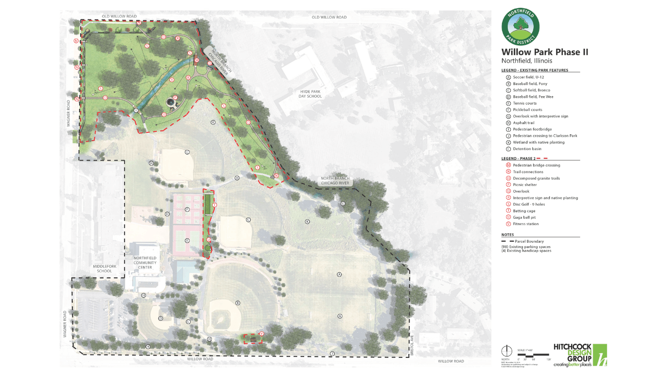 In January of 2024, the Park District was awarded an OLSD Grant to fund 50% of the proposed improvements to Willow Park. The estimated total cost of the project is $810,600 which includes improvements to the northern section of Willow Park with a focus on the natural areas and open space beautification. New amenities include crushed stone trail extensions, bird habitats, gazebo, new pedestrian bridge, river overlook, disc golf, gaga pit, general landscape enhancements, replacement of the batting cage and outdoor fitness stations.
